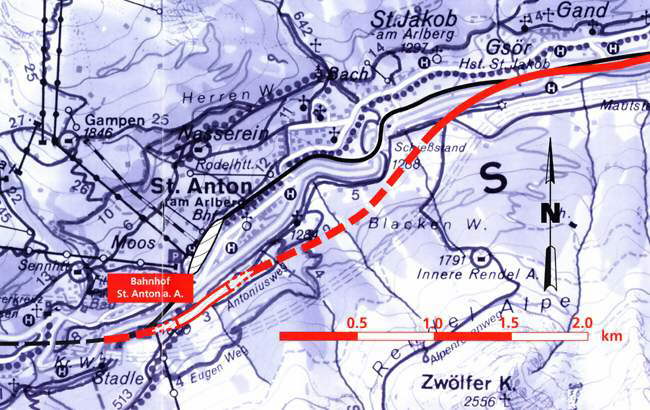 St. Anton am Arlberg hat seine Bahn aus dem Ort in ein Tunnelsytem verlegt und einen neuen Bahnhof errichtet.Realisierungszeit incl. Planung und Genehmigung 4,5 Jahre! (siehe unten)Änderung der Trasse auf 6,5 km.