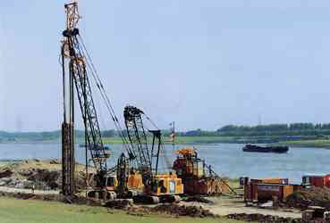 Einbruch des Erdreichs mit einem Wasser-Lehmschlamm (Bentonit) gestützt. Die Bewehrung (Eisen) wird eingebracht. Dann wird Beton mit Rohren von unten beginnend eingebracht, welcher den leichteren Wasserlehmschlamm