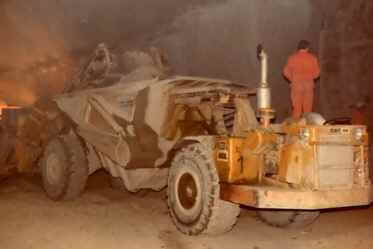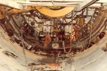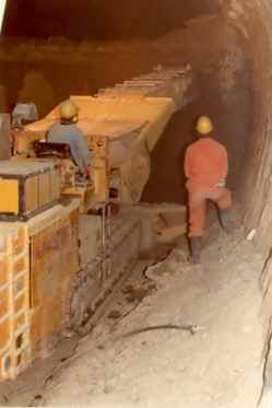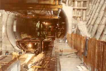 Berg, der Abraum wird entfernt, Betonfertigteile (Tübbinge) werden taktweise kreisförmig eingebracht und zum Fels wird ausbetoniert.